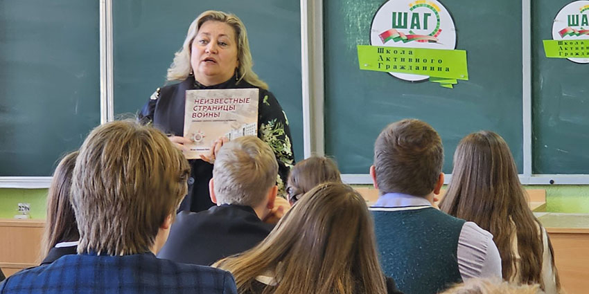 В ходе разговора со школьниками Оксана Евгеньевна поделилась мыслями о патриотизме, личном вкладе каждого в будущее Беларуси. Рассказала и о значимости издания «Неизвестные страницы войны открывают депутаты белорусского парламента». Книга создана по инициативе членов первичной организации Палаты представителей РОО «Белая Русь». В ее основу легли уникальные исторические материалы о тех, чьи судьбы были связанны с Великой Отечественной войной. Среди них есть и история нашего земляка Василия Ивановича Семеновича, который прошел непростой боевой путь. В присутствии учащихся Оксана Евгеньевна подарила книгу на долгую память учителю белорусского языка и литературы Елене Анатольевне Смоляк. Василий Семенович - дедушка Елены Анатольевны.